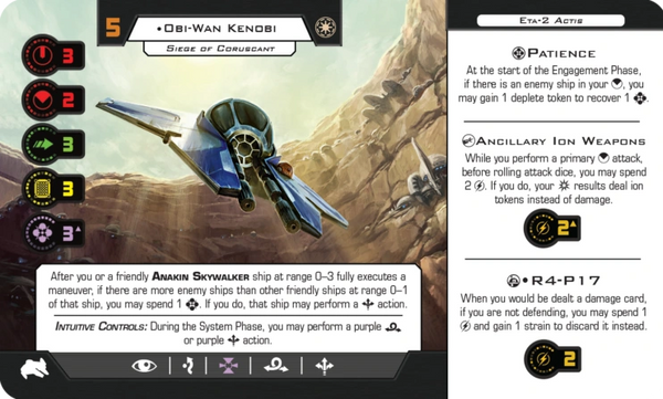 ETA-2 Actis is the small Jedi fighter seen at the beginning of Revenge of the Sith. It is might look similar in some ways to the Aethersprite equipped with Calibrated Laser Targeting: dial, stats, repositioning based on the use of Force charges. But in fact it is a more complex ship to fly, because it repositions before the maneuver, not after.