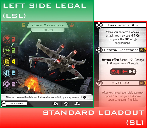 Left Side Legal (LSL): Pilot only part that can be used for standard play and customized with the limitation of available slots. In many cases such pilots have different abilities, stats or actions compared to their ship card versions. These are legal in Standard.